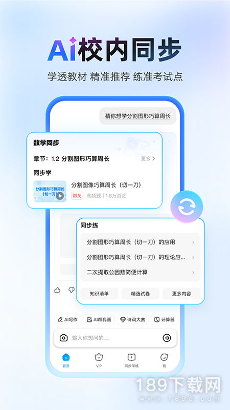 《作业帮》是一款致力于全国中小学生提供全学科的学习辅导服务,作业帮自主研发的多项学习工具,包括拍照搜题,古文助手,作文搜索等,在作业帮中,学生可以通过拍照,语音等方式获得难题的解析步骤。欢迎大家在189下载网下载作业帮