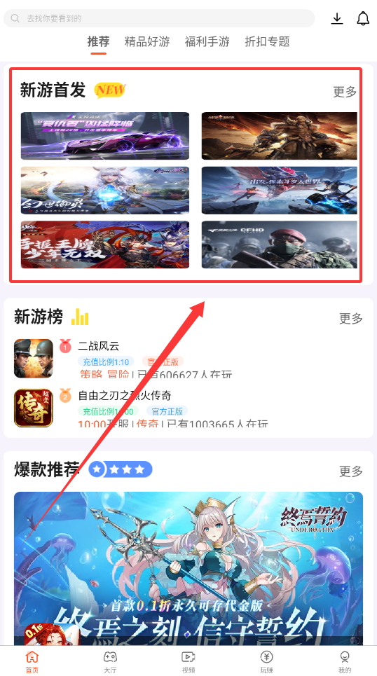 3、关注“今日新服”和“爆款推荐”板块,这里不仅提示新服开放时间,还会标注“首款0.1折”等特殊福利。