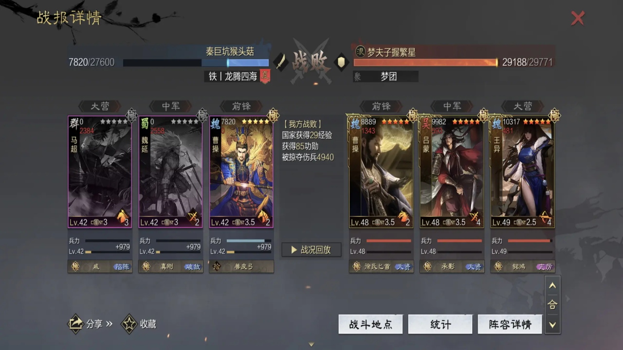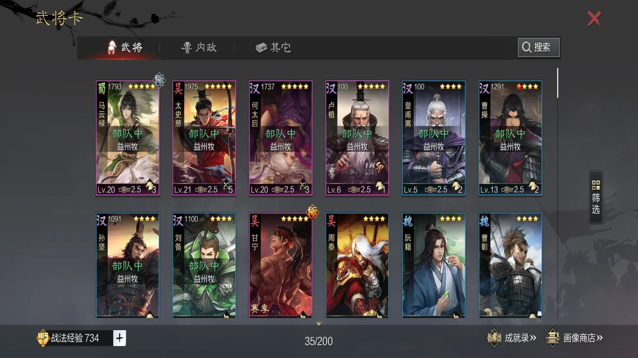 正常打完6块地之后,就卡在了第三章的8块三级地任务上了,此时秒三级校场,三级募兵所,给二队征兵,同时一队征兵也快结束了,结束后,直接拉满征兵。二队一般是在马超,马妹,木鹿,吕蒙,太后,卞夫人,吴夫人之间选择,其中太后/卞夫人/吴夫人为补c工具人,不征兵,如果【战必】跟【先驱】没有被一队占用,如开荒队伍为周泰/张机/关妹等,则二队最好选用马超/木鹿+马妹太后(【先驱+疏数+战必】)的组合,如果【战必】被占用了,那么二队采用吕蒙体系,有【先驱】则用木鹿或者马超,没【先驱】则用马妹,有【磐阵】用【磐阵】,无【磐阵】用【空城】,工具人带【反计】。